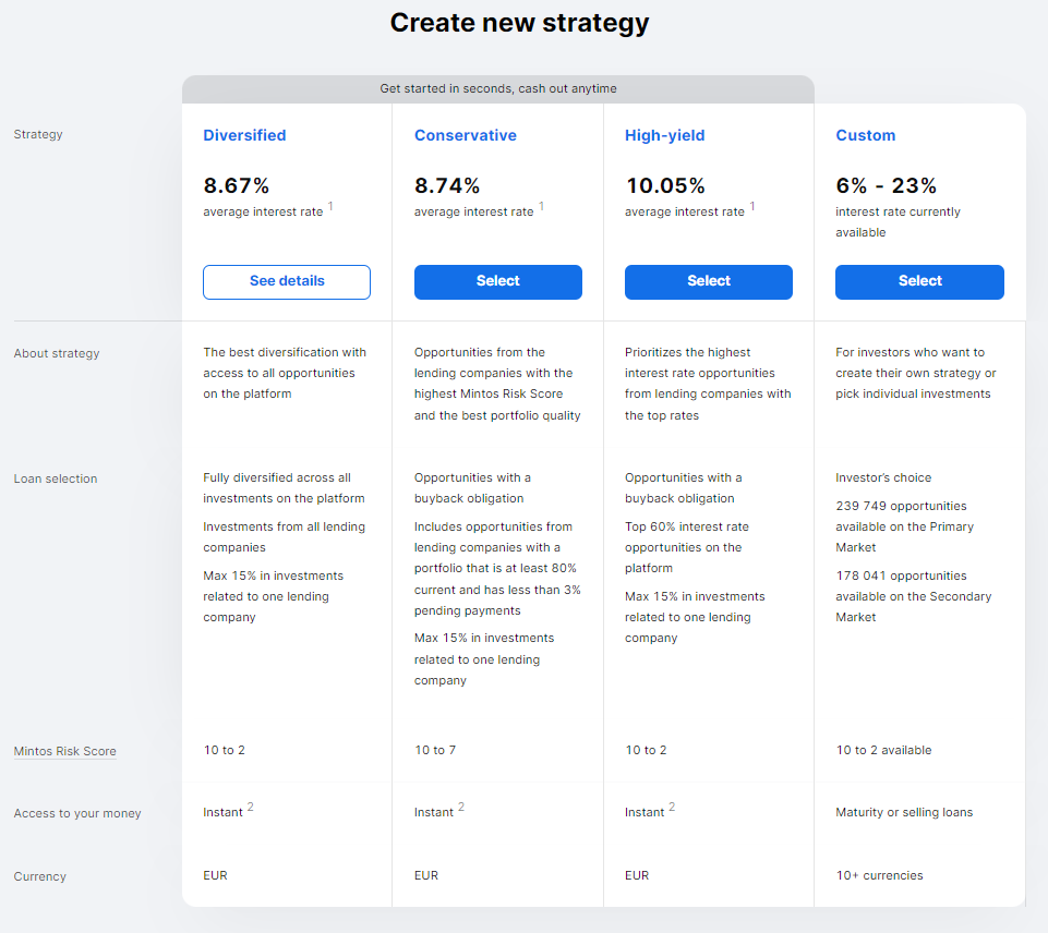Mintos est la plus grosse plateforme européenne en matière de prêt entre particuliers. En utilisant cette place de marché, un investisseur peut obtenir plusieurs prêts, la plupart avec une garantie de rachat, avec un retour sur investissement variant de 6 à 25 % sur une base annuelle. A ce jour, la plateforme compte + de 400 000 investisseurs, et a géré + de 7 milliards de fonds. Le taux d’intérêts moyen est de 9,47% (Fev 2022).