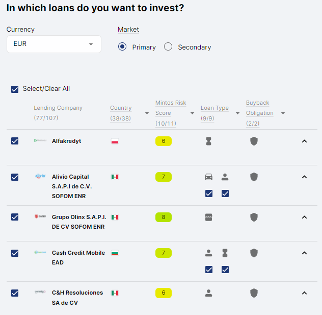 Mintos apporte des prêts sur le marché par le biais d’initiateurs de prêts de plusieurs pays à travers le monde, dans plusieurs devises.