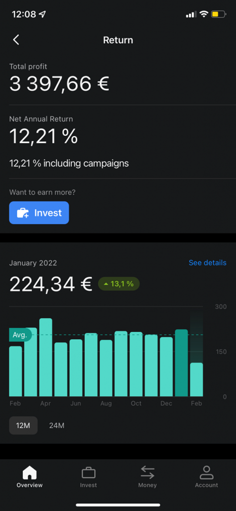 Mintos est la plateforme de prêt en particuliers sur laquelle j’ai investie le plus. il est possible de perdre de l’argent comme tout investissement. Il faut garder à l’esprit que le prêt P2P est toujours risqué . Mintos est la plateforme la plus sûre et la plus solide du marché en Europe. Mais cela ne signifie pas qu’investir via Mintos est sans risque. Pour preuve, vous pouvez voir mes résultats à ce jour. Toutefois, mes revenus sont à ce jour de 3409 euros pour un portefeuille total d’environ 25 000 euros .